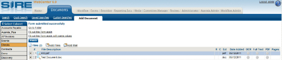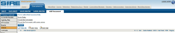 Review the information entered in the indexes, and Press the Save & Continue button to move to the next step. A message saying that the form was submitted successfully will appear, and the folder will have been created in the cabinet with the indexes. Alternatively, press the Back button to return to the previous page and make any corrections, or press the Cancel button to stop the submittal of the folder.