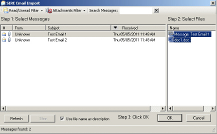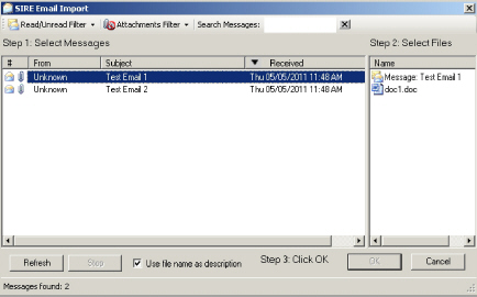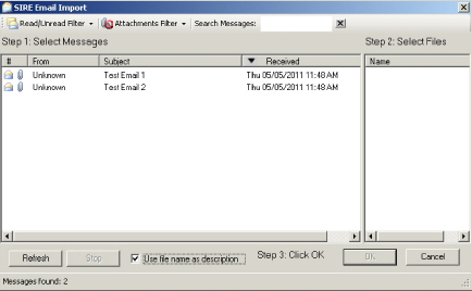 Refresh: Press the refresh button to load any new emails that have been added to the user's email since the SIRE Email Import window was opened.