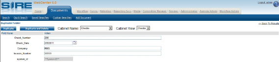 Select the cabinet the newly duplicated folder will be placed in from the Cabinet Name drop down field. If a different cabinet is selected than the original the system will place the index values into the new cabinet's indexes to the best of its ability.